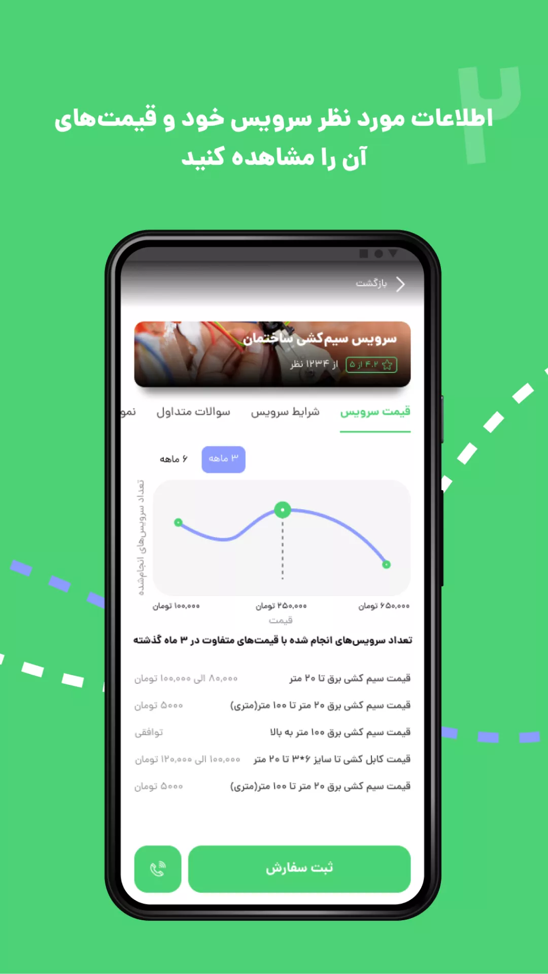 تنها فاصله شما با دریافت خدمات، ثبت سفارش رایگان و مذاکره با همیاران متخصص هوم سرویز خواهد بود. به راحتی می توانید سفارش خود را ثبت نموده و با بهترین و کارآزموده ترین افراد در زمینه سفارش خود ارتباط برقرار کنید و از نرخ های رقابتی و تعرفه قیمت خدمات مطلع شوید. پشتیبانی هوم سرویز از ابتدای ثبت سفارش تا انتهای کار پشتیبان شما خواهند بود.