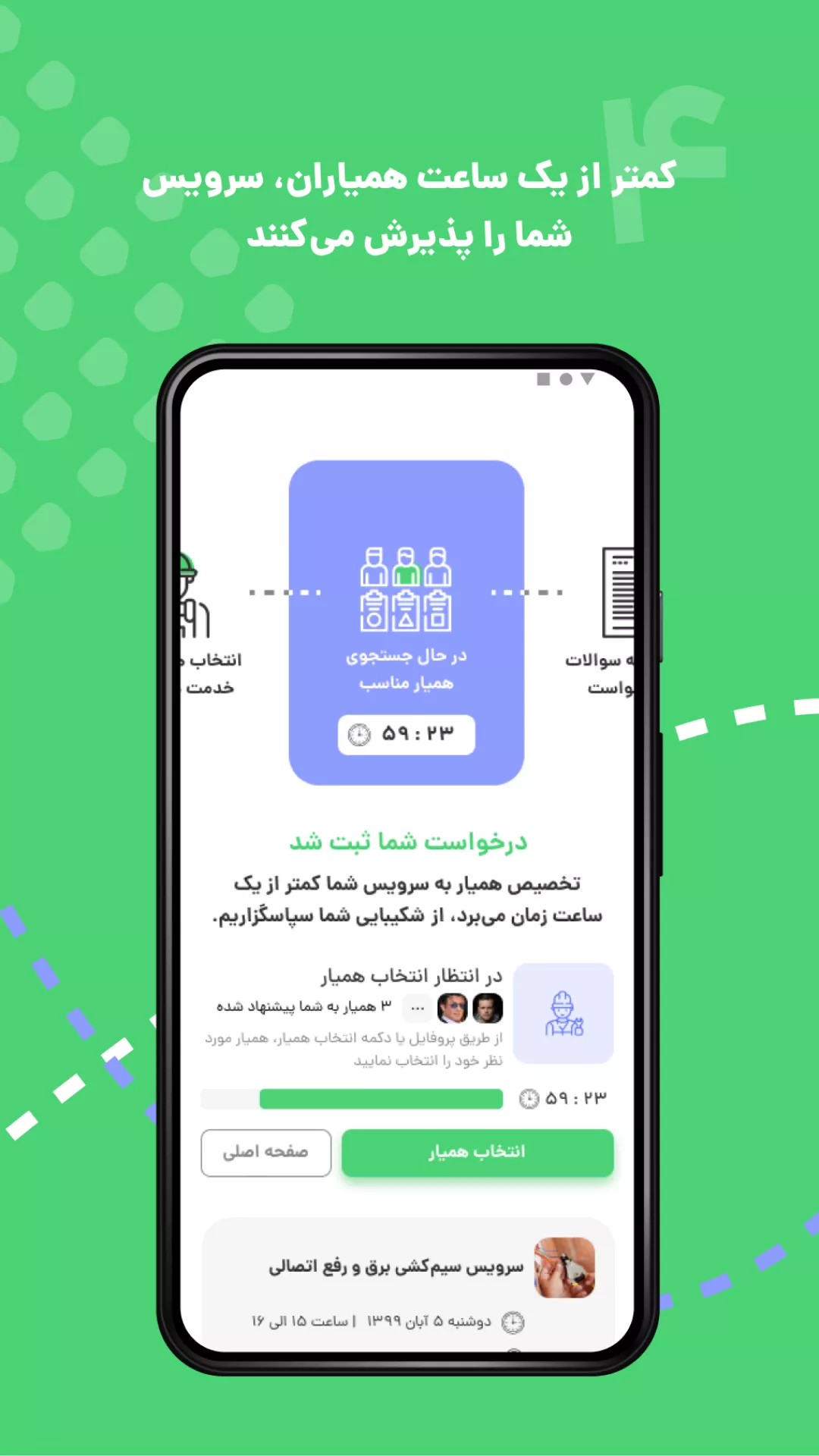 هوم سرویز با استفاده از الگوریتم های پیچیده این امکان را برای مشتریان خود فراهم نموده تا با دسترسی به نزدیکترین و حرفه ای ترین متخصصین و استادکار ها به سادگی و در زودترین زمان ممکن دسترسی داشته باشید.