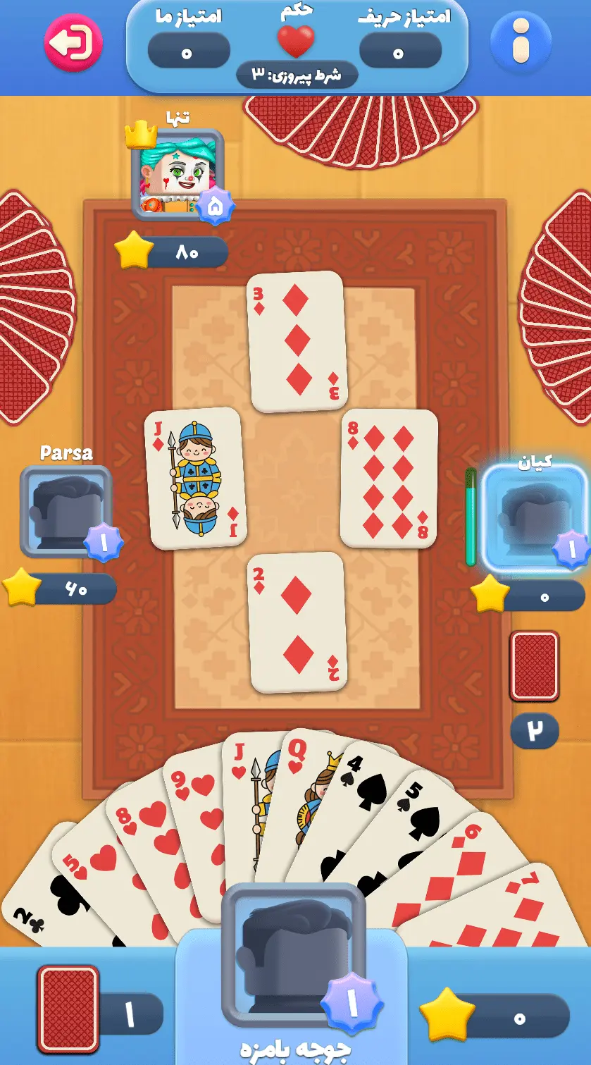 سرعت بالای بازی، طراحی ساده اما دلپذیر، و حس رقابت واقعی باعث شده حکم آنلاین بهترین انتخاب برای همه عاشقان بازیهای کارتی بشه. چه حرفهای حکم باشی، چه تازهکار، اینجا میتونی مهارتت رو تقویت کنی، بهتر بازی کنی و حتی توی جدول رتبهبندی بالا بری و خودتو ثابت کنی.